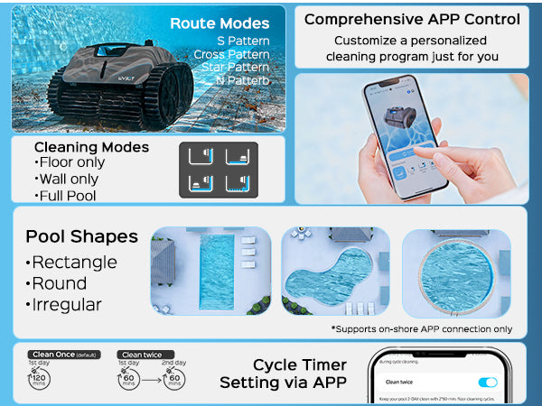 - Why you need APP: Cause it tailors cleaning just for you. You can have it clean just the floors, just the walls, or the full pool. Plus, with the time cycle feature, you can set up regular cleanings as per your needs. What's even better? We're constantly updating algorithms through the app, offering ongoing OTA upgrades for your machine. It's all about making your cleaning experience personal, convenient, and ahead of the curve—something other machines just can't match.