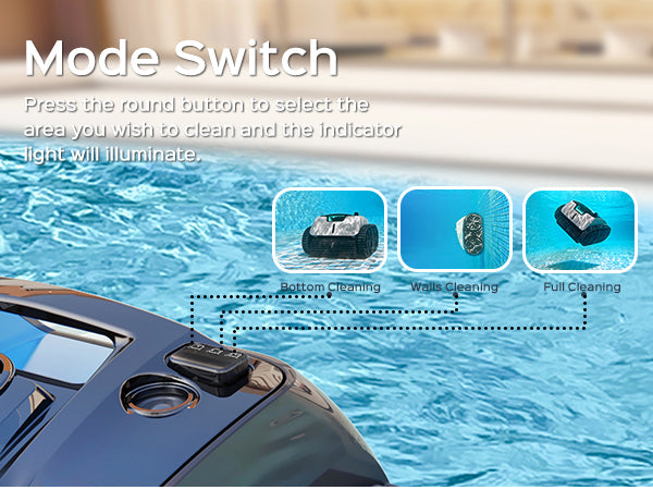 - Mode selection, One Button: While other machines can only execute default settings, it's already providing button-switchable cleaning modes for you. Press it gently with your finger and the indicator light will show you the pool area it will clean. Of course you can also switch via the app —— Button or APP, you have the right to choose what you prefer.