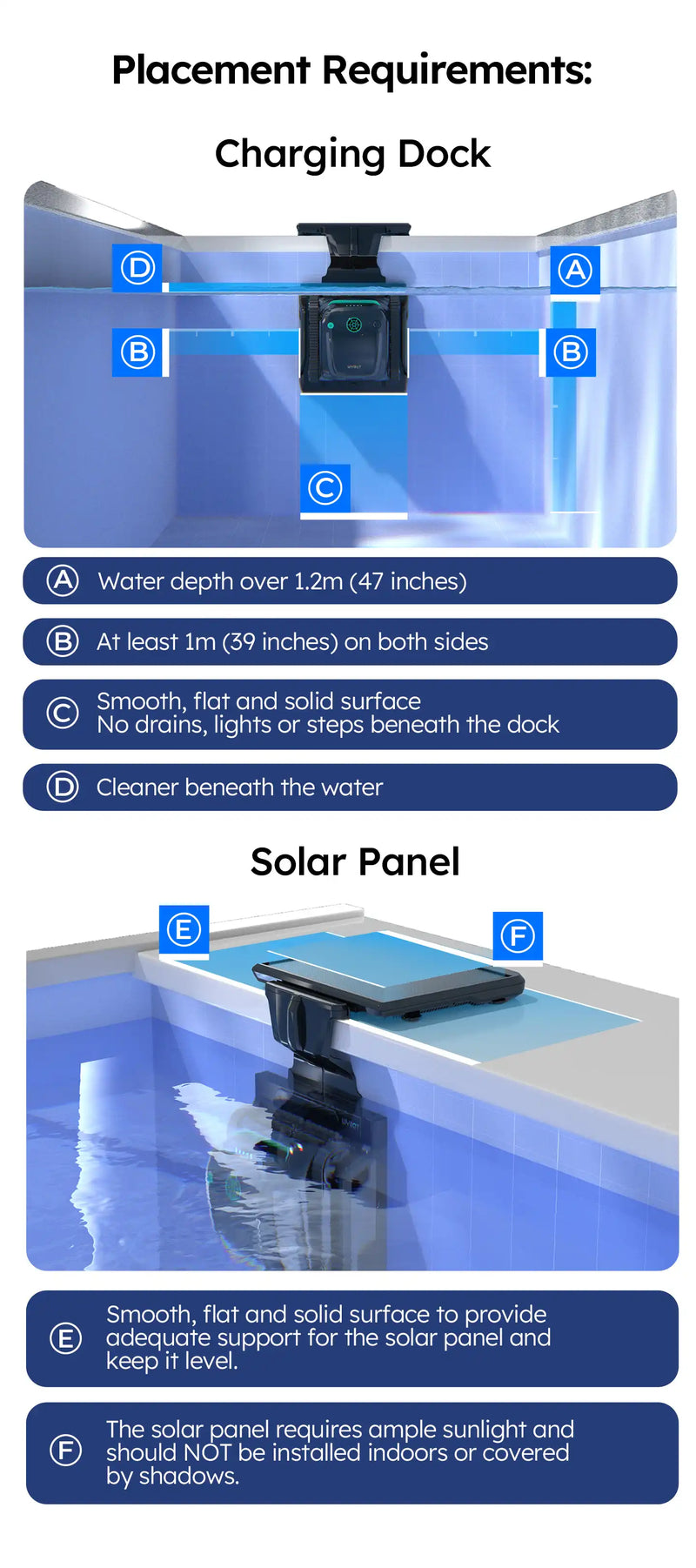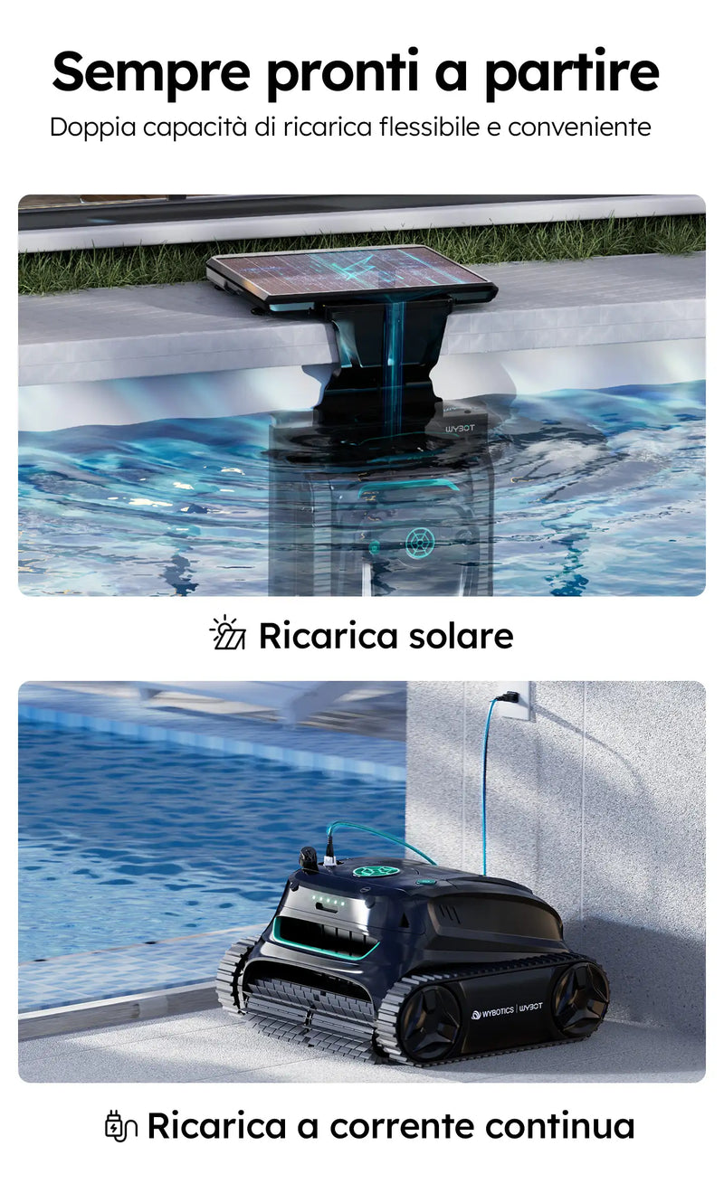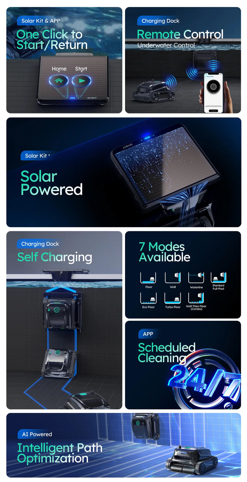 • World's First Underwater Robotic Pool Cleaner with Dual Charging Options – Harness the sun for eco-friendly charging in 2 days, or plug in for instant power. Flexibly switch between solar and DC charging to suit your needs, with no more battery worries.